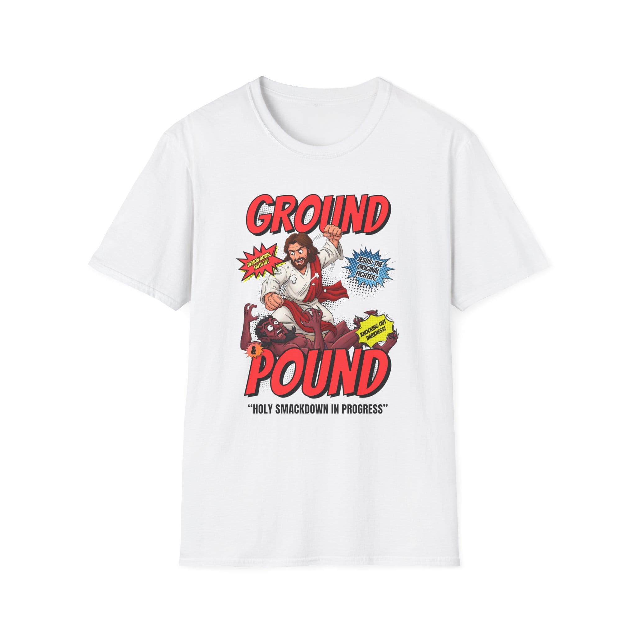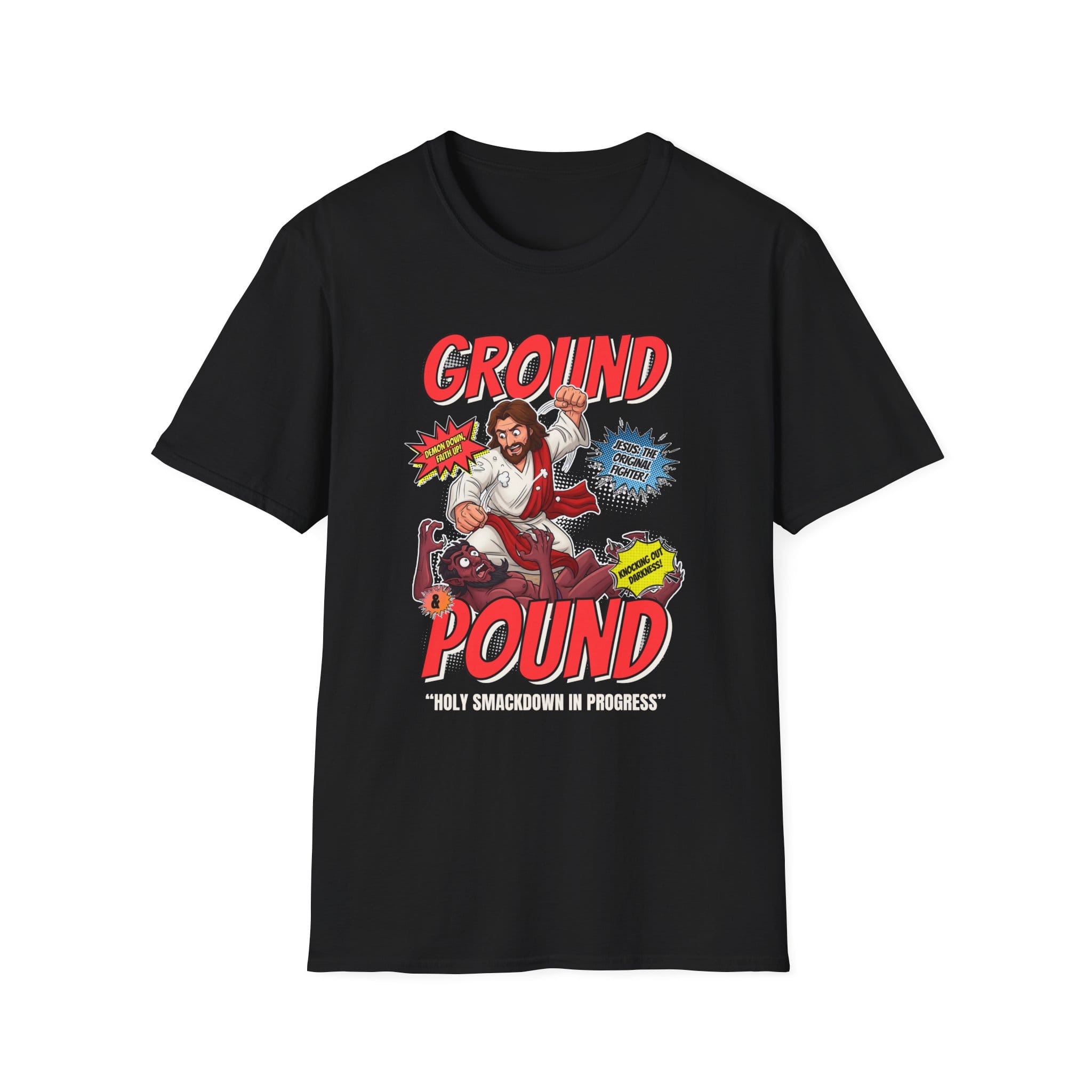 Jesus delivers divine justice with a thunderous ground and pound in this bold, heavenly-meets-hellish clash. Whether you’re religious or just love a good MMA parody, this tee hits hard. A perfect mix of grit, faith, and fists. Check it out along with others in our MMA category and Funny collection.