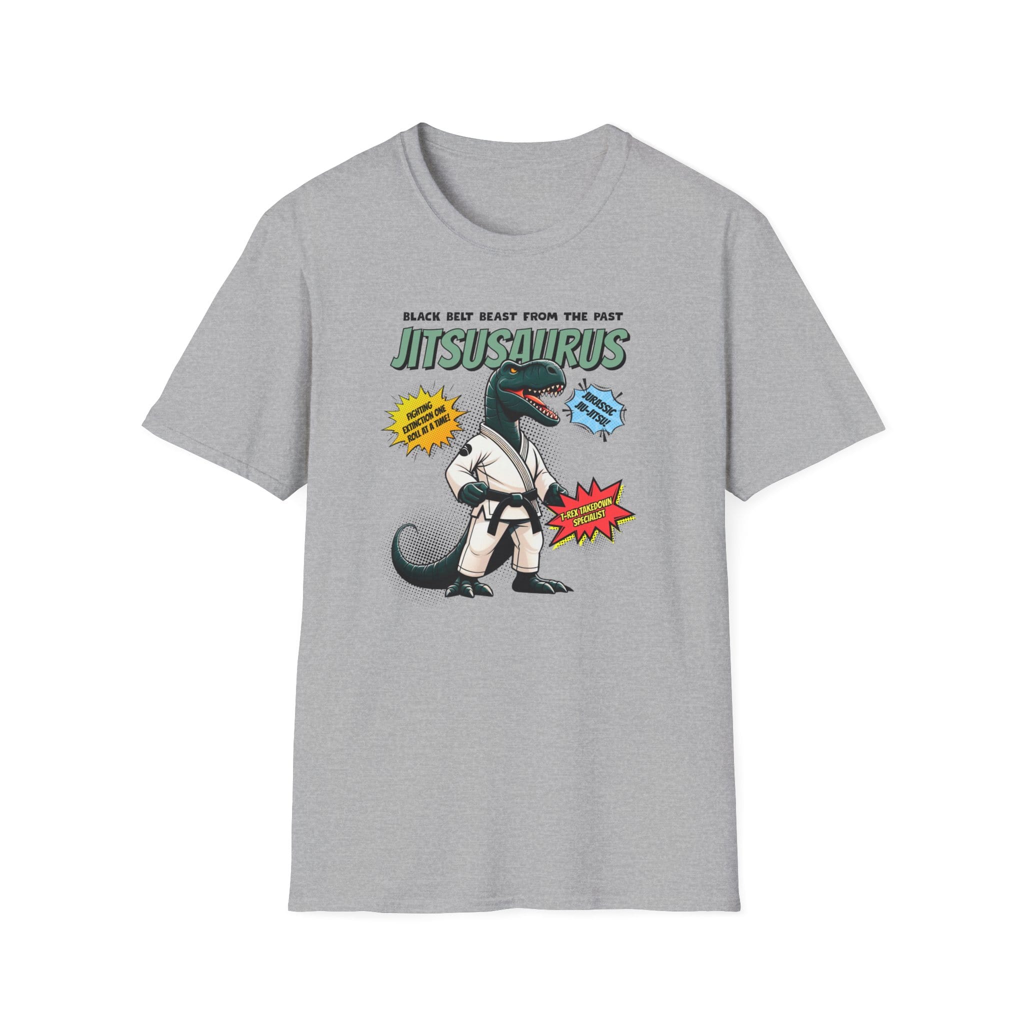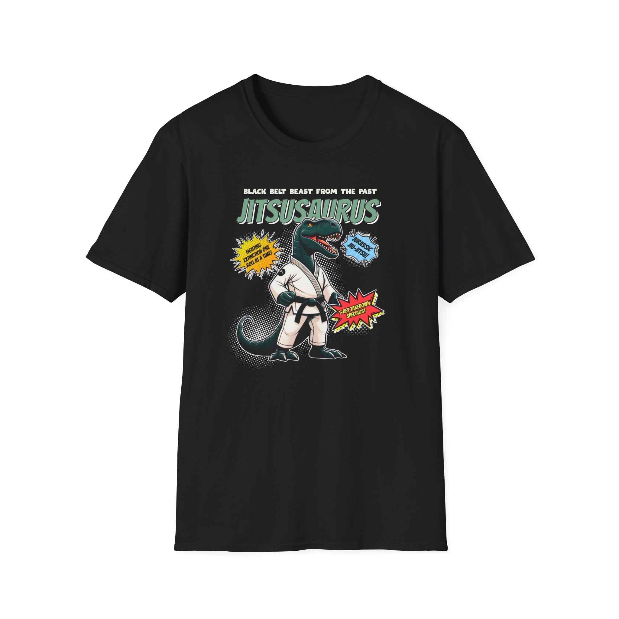 The gi goes prehistoric. This cartoon dinosaur rocks a black belt and serious jiujitsu attitude. Whether you’re rolling or roaring, it’s a grappler’s dream tee. Explore more in the Jiujitsu category and Funny category.